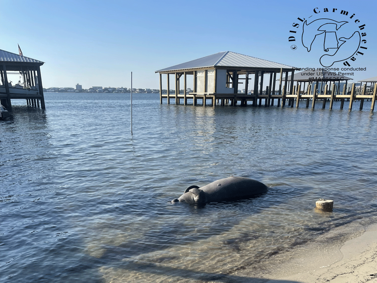 Dauphin Island Sea Lab’s Manatee Sighting Network (DISL/MSN) received reports of a deceased manatee in Orange Beach, Alabama on Tuesday, November 1. When the team found the animal there were signs of acute trauma consistent with a boat strike.
