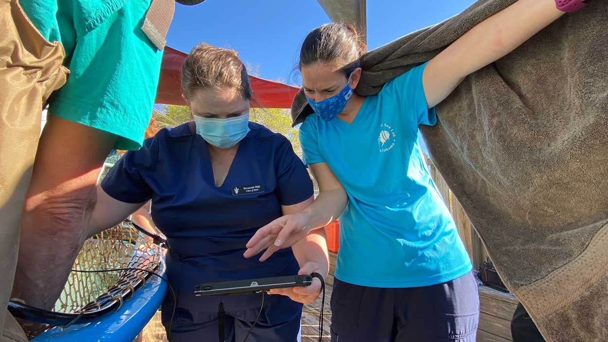 The most recent ultrasound in March showed the cownose ray pup is growing. Dr. Bloodgood was assisted by Savannah Wall. She is a fourth-year veterinary student from the University of Georgia completing a clinical externship rotation with DISL/ALMMSN.