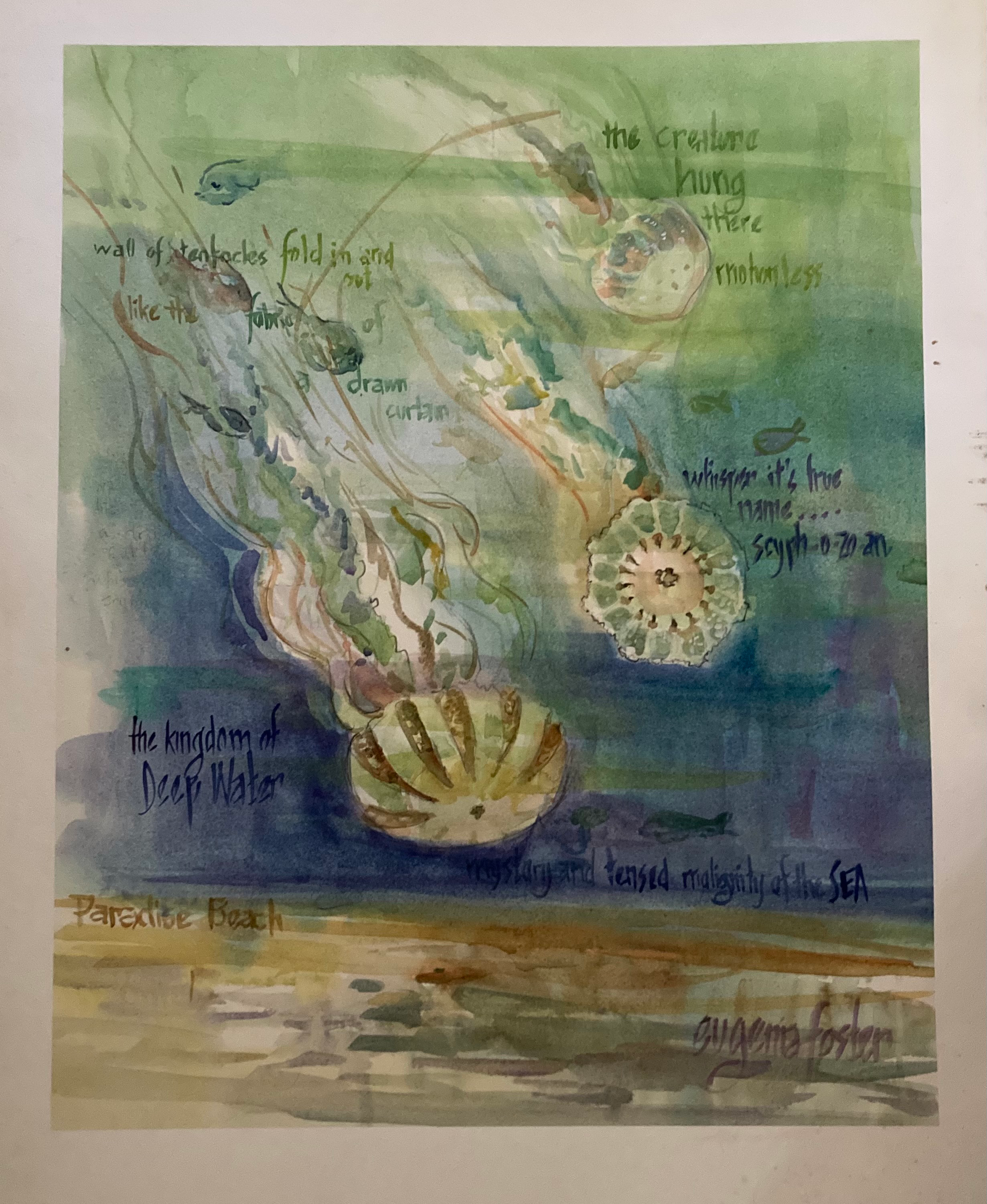 Foster said Dr. Bob Shipp had asked her to create a painting for Wilson. She took her inspiration from Wilson’s vivid childhood memory of a jellyfish which he recalled in his autobiography, The Naturalist. Foster said she was very careful to make sure her painting depicted the symmetrical nature of jellyfish which were accompanied by key phrases of Wilson’s childhood memory. The painting included keywords from Wilson's description of the moment in his life.