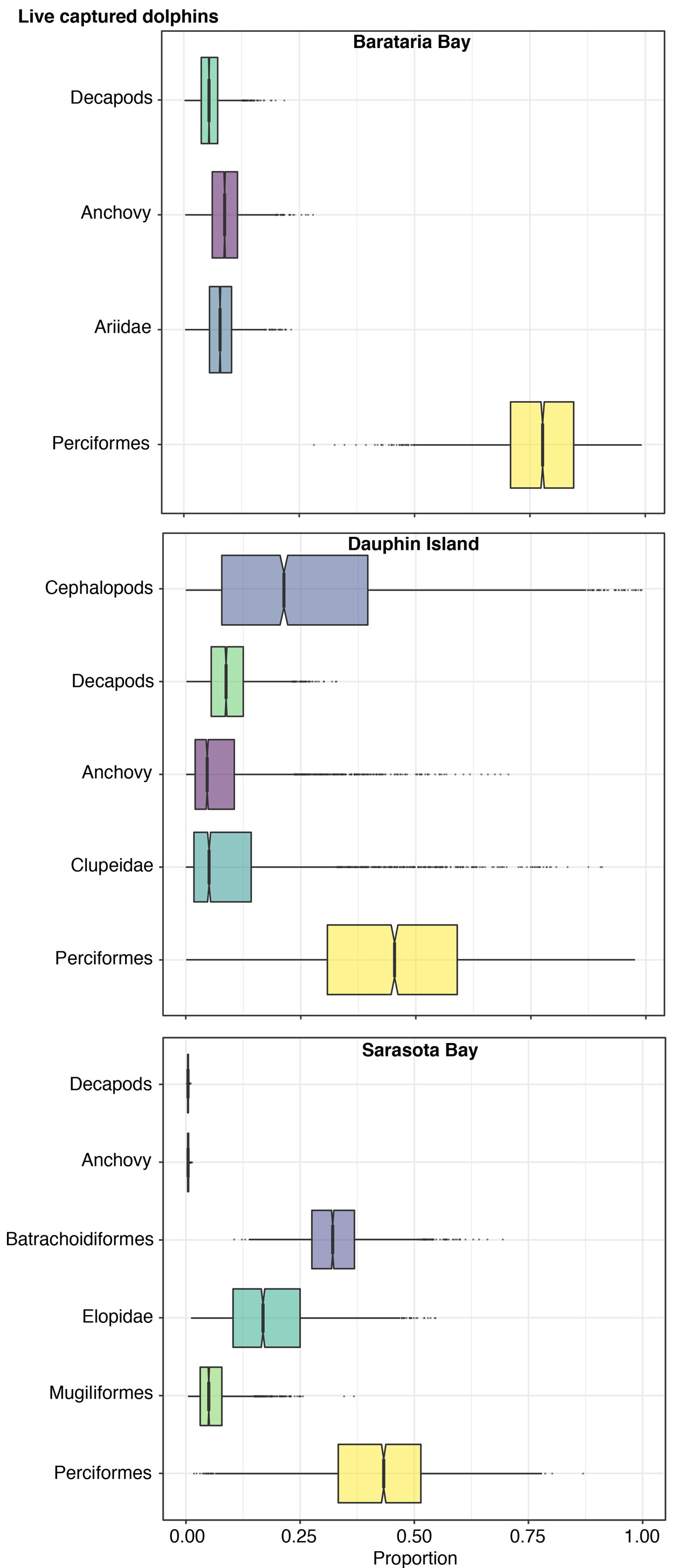 For example, dolphin diets around Dauphin Island changed through time with fish being the most common but shifting to squid in certain years. This suggests that dolphin diets can be quite flexible, and that can help dolphins mitigate environmental disturbances, such as harmful algal blooms, that can change prey availability.