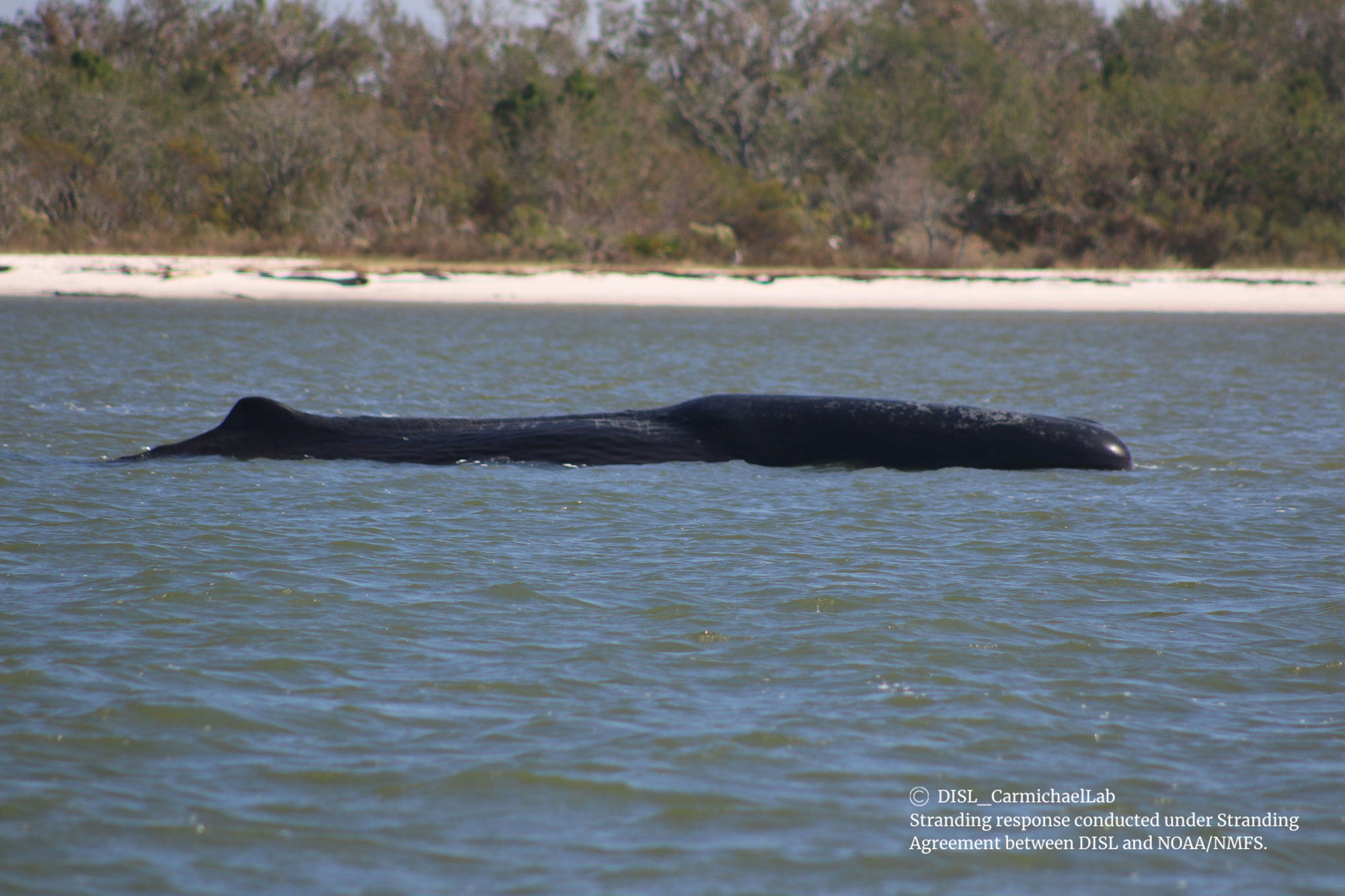 Dauphin Island Sea Lab’s Marine Mammal Research Program personnel responded to a live-stranded, approximately 35-foot sperm whale in Mobile Bay on Thursday, November 19, 2020. This is the first documented stranded sperm whale in the state of Alabama. The team worked in collaboration with the Alabama Department of Conservation and Natural Resources (ADCNR).