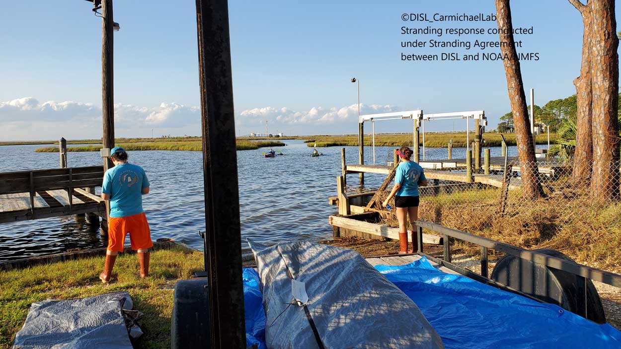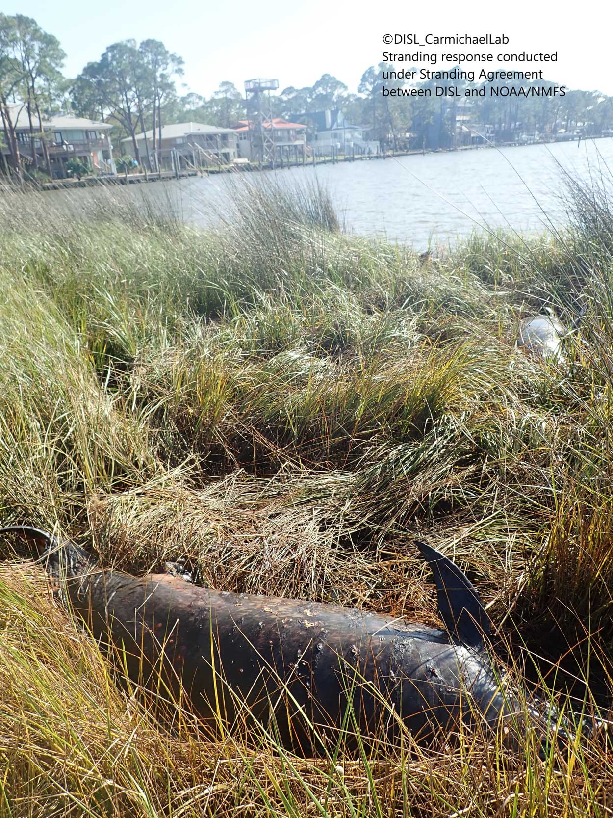The Alabama Marine Mammal Stranding Network (ALMMSN) is the state network for response and recovery of sick, injured, and deceased marine mammals, such as dolphins and whales. The mass stranding was discovered by a paddle boarder in Graveline Bay near Dauphin Island. Staff from the ALMMSN quickly responded to the scene and located the dolphins. Many of the dolphins were hidden from sight in the tall marsh grass.