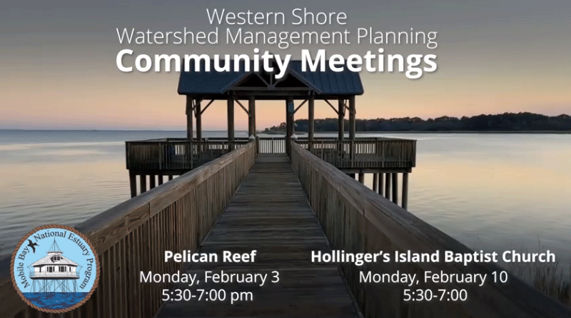 “We know Mobile Bay is a very special place to so many people,” said MBNEP Director Roberta Swann. “This Plan is about ensuring the Bay continues to provide recreational, scenic, economic, environmental, and other benefits to all who care about it. The Mobile Bay National Estuary Program’s mission is to ensure the wise stewardship of the quality and living resources of Alabama’s estuarine waters. The Western Shore Complex Watershed Management Plan is a key element to our mission, and community participation is vital to its development. We hope every resident who cares about Mobile Bay’s Western Shore will turn out.”
