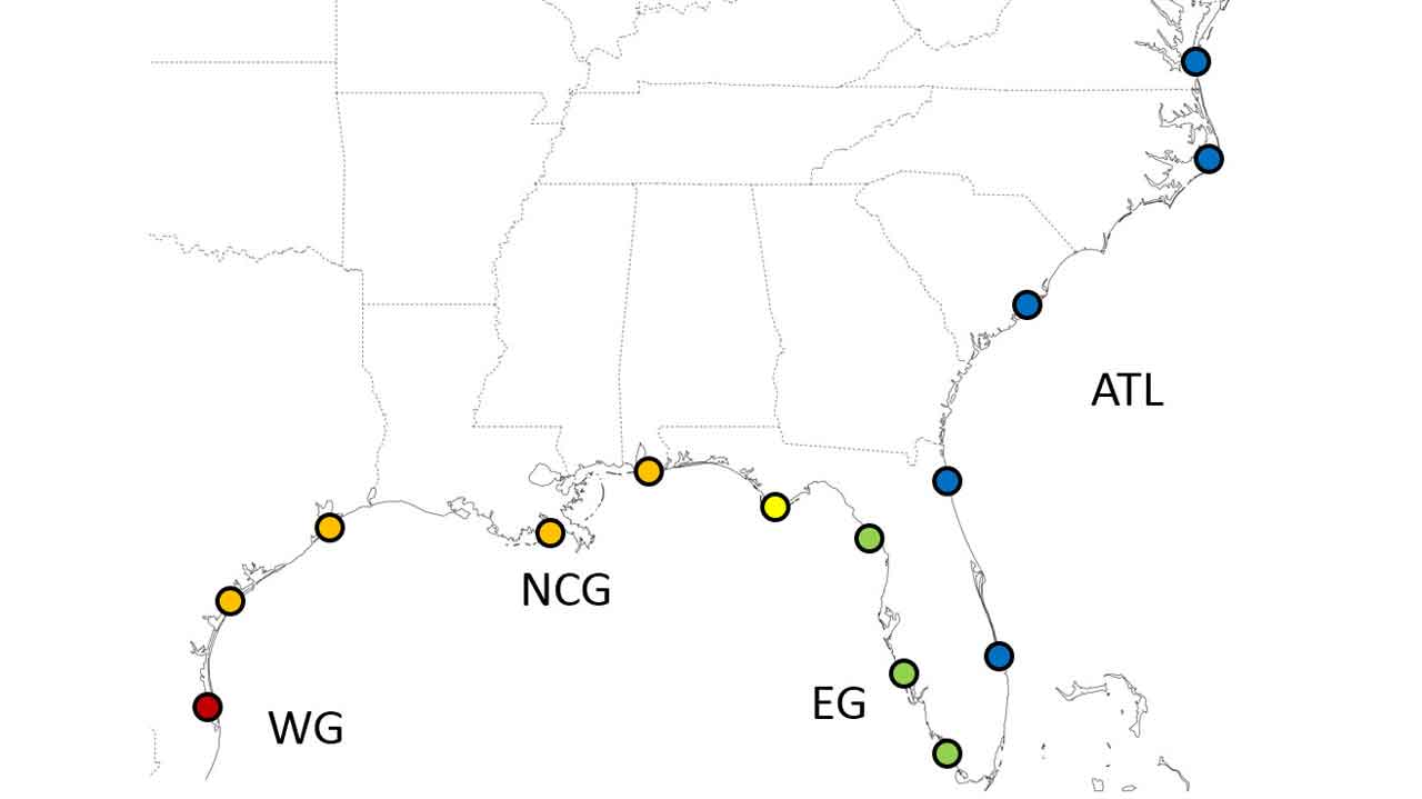 Population genetic data (microsatellite genotypes) indicate genetic divergence in sheepshead across the tip of the Florida Peninsula and both morphologic and population genetic data indicate divergence across Apalachee/Apalachicola Bay in the Florida Panhandle.