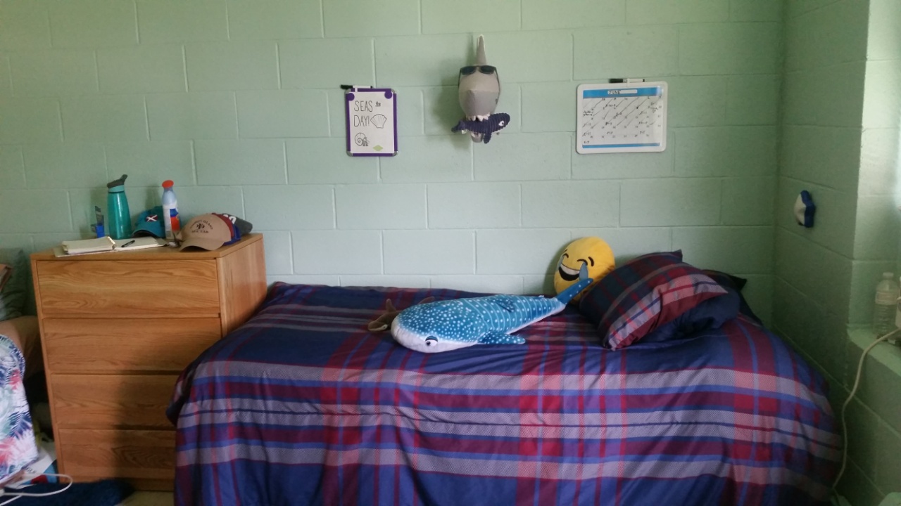 The main dorm buildings on the Dauphin Island Sea Lab campus are used year-round, both for field trip groups as well as summer programs. Each dormitory can house up to 86 people in 43 rooms, each containing 2 twin beds, a dresser, desk, closet space, and a single-unit air-conditioner.