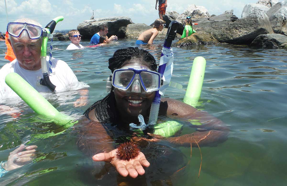 As part of the course, students participate in several field trips away from the island. They visit the Audubon of the Americans for a look behind-the-scenes and explore careers in the aquarium business. The students tour the Gulf Coast shoreline by bus, noting human impacts and habitat alteration. They also travel to the seagrass meadows and rocky shorelines in the Florida panhandle, observing marine organisms in their natural environment firsthand. For some, this is their first time snorkeling and many students have remarked this literally immersive experience crystallized the class for them.