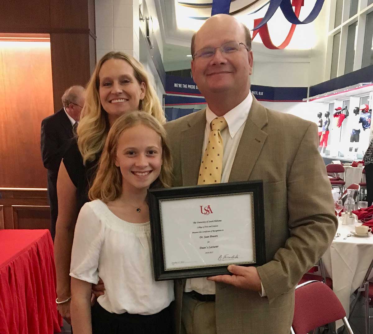 Dr. Sean Powers was presented the 2017 Dean's Lecture Award in recognition of his academic excellence throughout his career during the ceremony at the Mitchell Center Globe the evening of Tuesday, October 17. As a part of the ceremony, Dr. Powers presented a talk on "Ecology You Can Eat: Improving Fisheries Management in a Changing World."