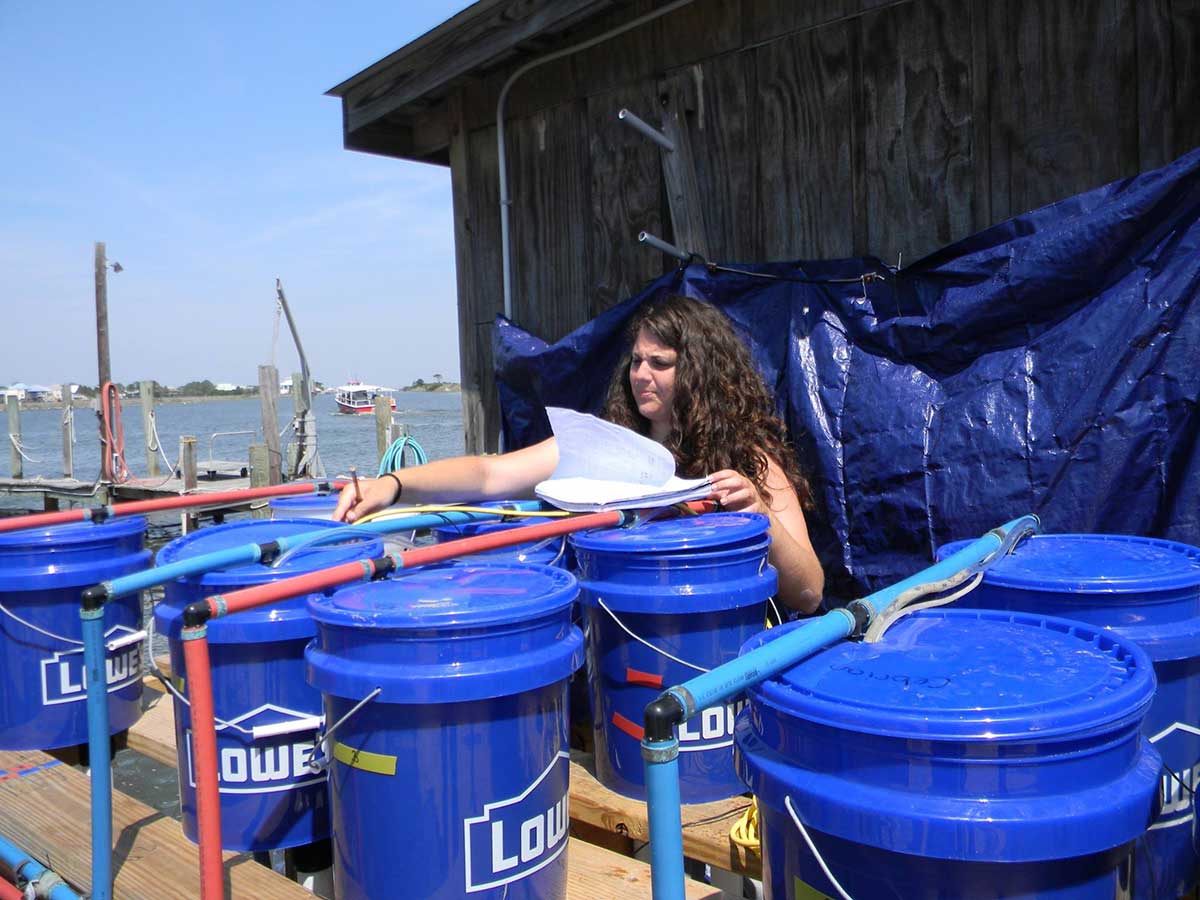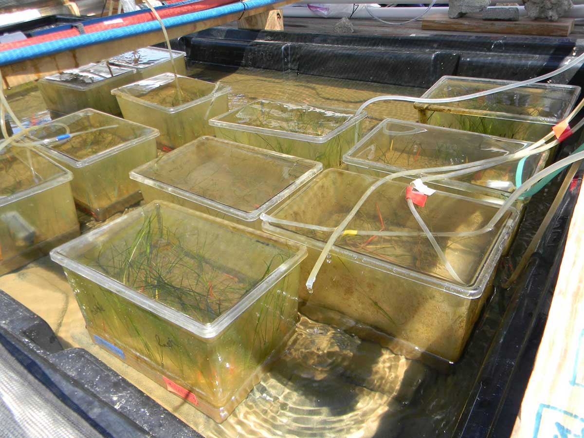Meseguer measures leaf growth and grass distribution/competition based on the changes of pH, simulating ocean acidification due to ocean uptake of carbon dioxide from the atmosphere. She and her Cebrian lab mate intern Sara Schmid also monitor temperature and conductivity as a function of pH.