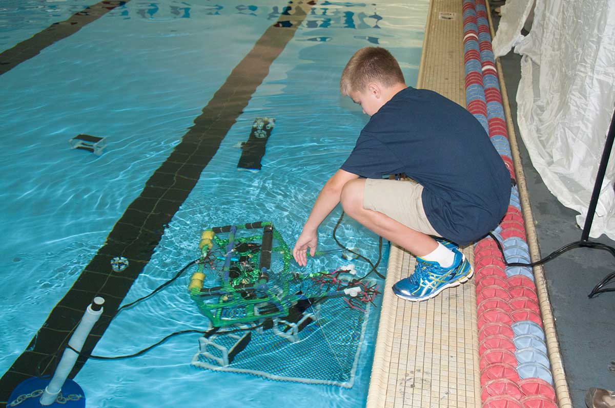 The competition will run from Friday, April 21- Sunday, April 23. Friday begins with check-in and a welcome followed by ROV safety inspections. Saturday all day is spent at the pool with 2 rounds of pool missions, where the ROVs have a limited time to complete a set of tasks relating to the theme. Finally, on Sunday, teams present an engineering presentation on their ROV design and then share their ROV design and company more casually during a poster session. Last, but certainly not least, is the awards ceremony. Teams compete not only for the top places in their class, but also for awards in teamwork (Tethered Together) and best comeback (Buoyancy).