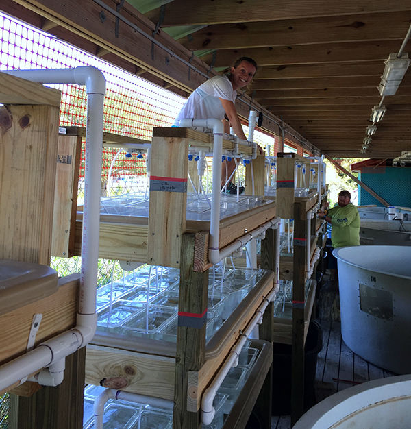 Every day the shelving systems are monitored for salinity and water levels and the oysters are fed a diet of mixed algae concentrate. ACER Post-Doctoral Researcher Dr. Meagan Schrandt said at the end of the experiment, all the oysters will be counted to compare the number of live and dead oysters in the treatments and two subsets of samples will be taken: one for measuring shell growth and one for looking at general oyster condition using a formula relating the amount of tissue to the amount of shell for each oyster.