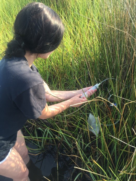 Photo: REU Brittany Zepernick collects samples of rhizosphere pore water. The samples are brought back to the lab where Zepernick extracts the dissolved organic matter from the rhizosphere pore water.