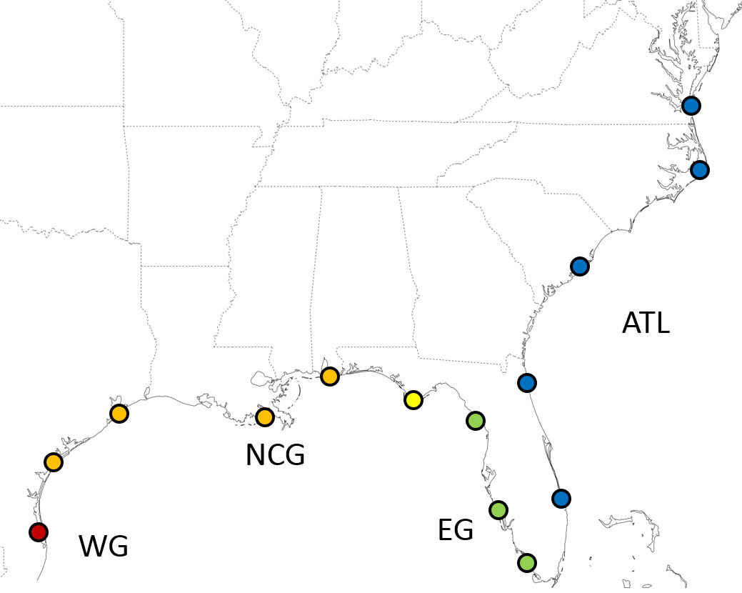 The study of population connectivity and subdivision is vital to the proper management and conservation of species and furthers the study of evolutionary biology and ecology. Sheepshead, Archosargus probatocephalus, are a euryhaline sparid fish that are ecologically, commercially, and recreationally important in the southeastern United States 1. Population genetic data (microsatellite genotypes) indicate genetic divergence in sheepshead across the tip of the Florida Peninsula and both morphologic and population genetic data indicate divergence across Apalachee/Apalachicola Bay in the Florida Panhandle 2. Divergence across Apalachee/Apalachicola Bay is not proximal to any known hydrographic barriers and may be maintained by divergent selection between the divergent environments/ecosystems of the fresher, turbid, and more productive north central Gulf of Mexico coastal waters and the salty, clear waters of the west coast of the Florida Peninsula. In collaboration with the Marine Genomics Laboratory at Texas A and M University Corpus Christi, we aim to re-examine sheepshead population structure using reduced representation genomics and more extensive geographic sampling to increase the resolution of neutral population structure (Figure 1) and make inferences on patterns of selection by partitioning out putatively selected loci using multiple methods of genomic outlier detection.