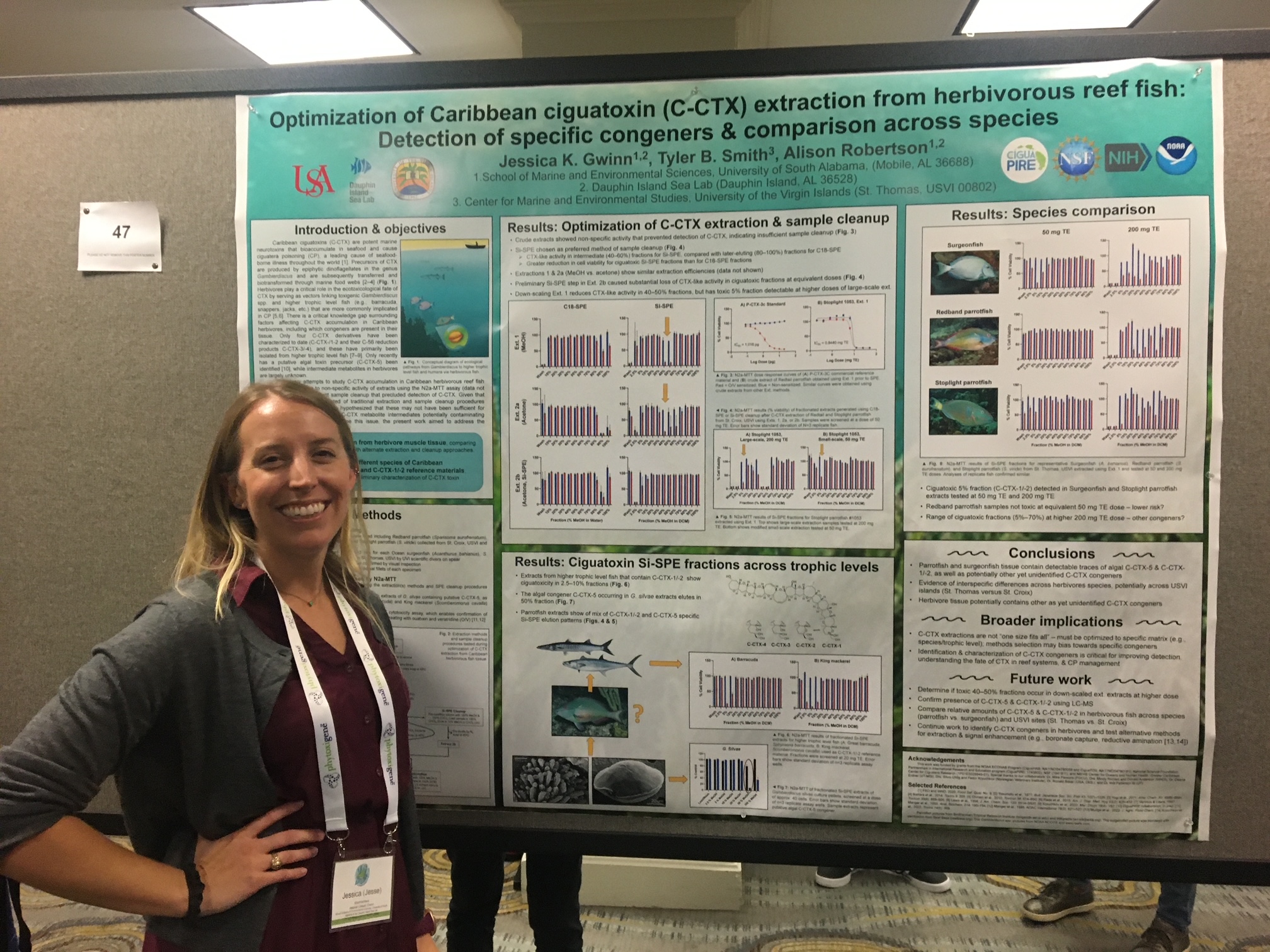 “The Knauss fellowship is a wonderful next step for Jesse’s career.” Dr. Alison Robertson, a faculty member for DISL and the USA School of Marine and Environmental Sciences and Gwinn’s Ph.D. advisor, said, “Aside from her scientific contributions to ciguatera research, Jesse has always shown an interest in the application of science to inform policies aimed at protecting marine resources as well as the safety and socioeconomic health of coastal communities. This fellowship will be a nice opportunity for Jesse to gain a big-picture view of the science she has been doing over the past 5-6 years and an opportunity to expand and learn more about this important side of marine science. I have no doubt that she will thrive in this role, just as she has over the course of her doctoral degree.”