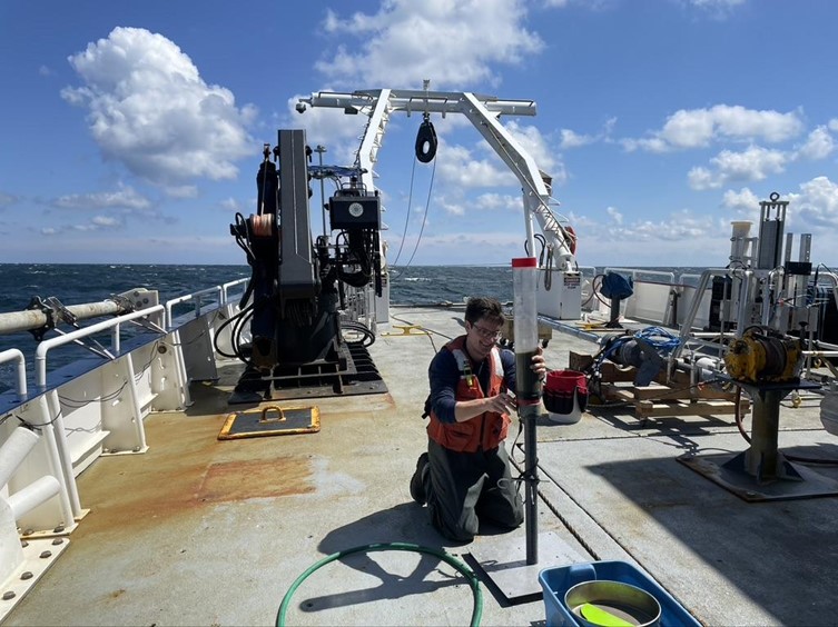 In April 2022, we traveled from Dauphin Island to Massachusetts to participate in a research cruise with scientists from the University of Texas at Austin and the United States Geological Survey (USGS) on the New England shelf. Aboard the University of Rhode Island’s R/V Endeavor, we sailed to the edge of the continental shelf to study how acoustic signals (e.g., those used to map the seafloor) are affected by the physical and biological properties of seafloor sediment.