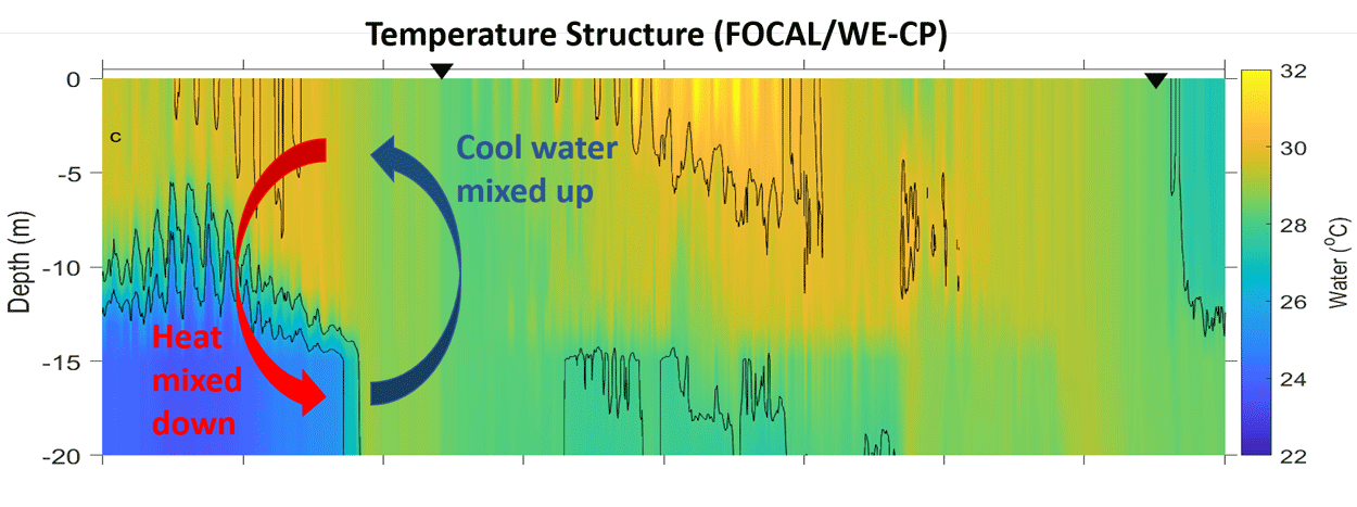 Unlike the deep ocean, the continental shelf has a shallow bottom that limits how much cold water can be mixed up to the surface, cooling the sea surface temperature and weakening approaching storms. Dzwonkowski and his team focused on how a strong mixing event pushes surface heat downward and clears the bottom water of its cold water reserve. If this mixing is followed by a period of rewarming, such as an atmospheric heatwave, the shelf’s oceanic environment could be primed for the potential generation of extreme storm events, i.e. Hurricane Michael.