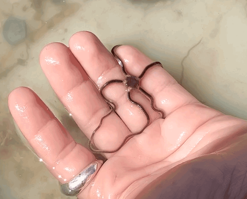 The circular shape in the center of the brittlestar is the oral disk. When buried, the oral disk will sit below the surface, while the arms reach above the surface to feed.