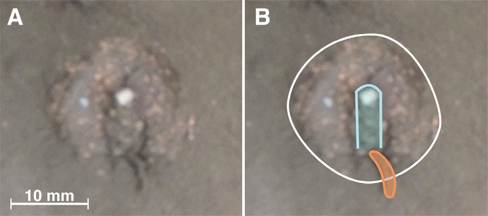 (A) Unmanipulated photograph of the feeding area of Owenia fusiformis; the worm’s feeding activities have uncovered the layer of orange luminophores. (B) Same photograph with the O. fusiformis tube highlighted in light blue, feeding area traced in white, and fecal rod highlighted in orange.