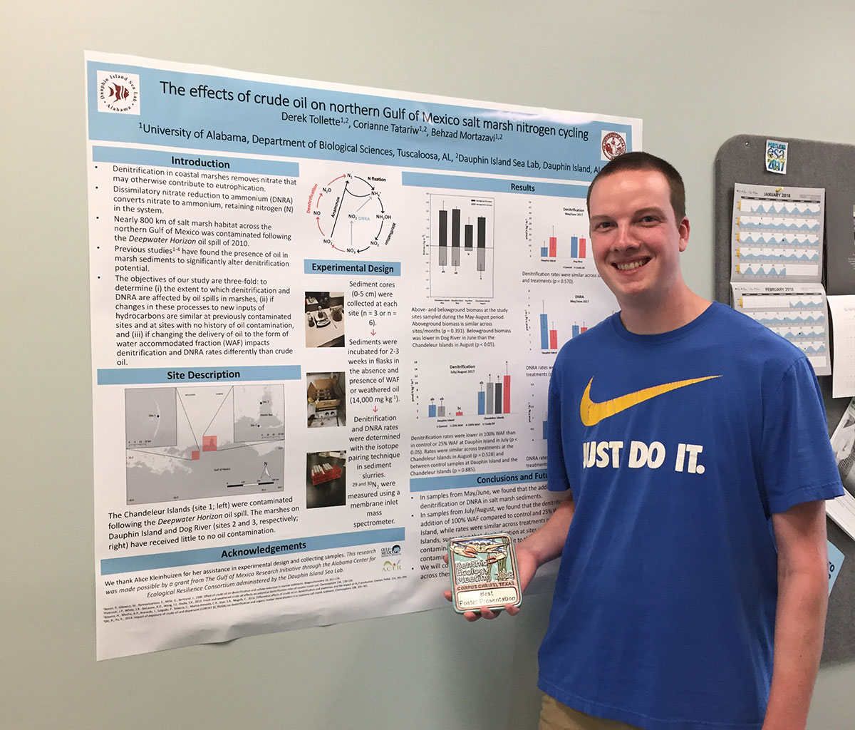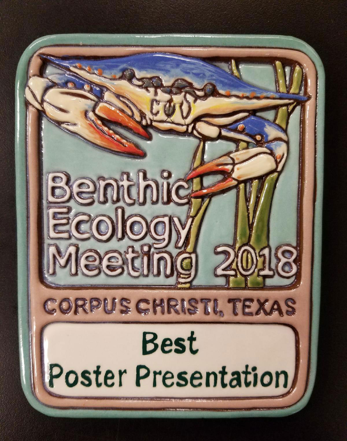 Derek Tollette's research impressed at the Benthic Ecology Meeting. He brought home the award for best poster from the 2018 conference held in Corpus Christi, Texas.